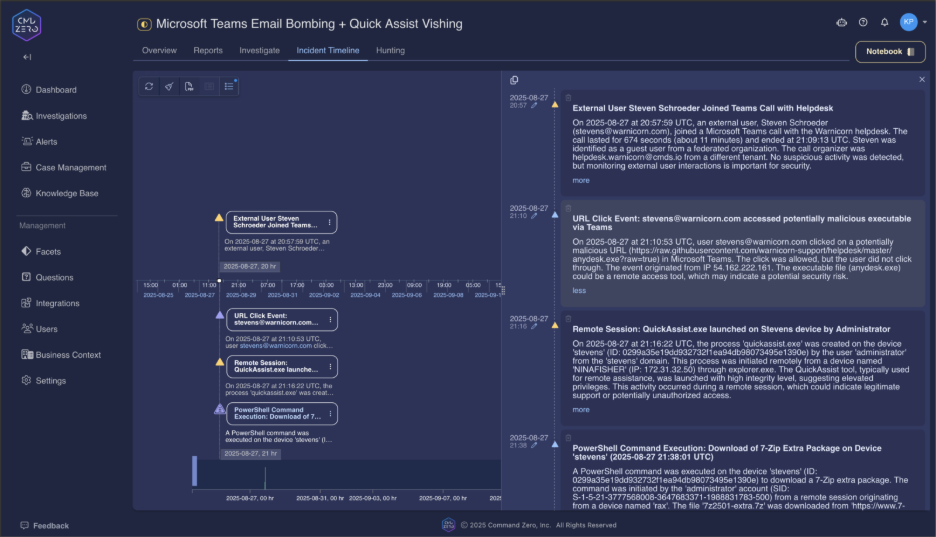 Command Zero recognizes these attacks for what they are: coordinated operations that require comprehensive investigation across email, communications, and endpoint telemetry simultaneously.